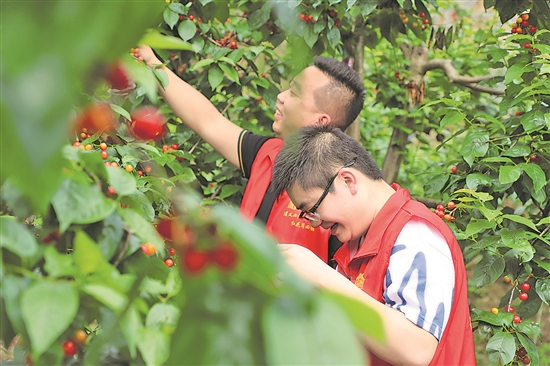 图为贵州省遵义市红花岗区南关街道金华村樱桃园内,党员志愿者正在帮助果农采摘樱桃。金华村种植的樱桃迎来丰收季,当地结合农业生产开展“党员+农户”志愿服务活动,帮助果农采摘、促销。(田景芳 摄)