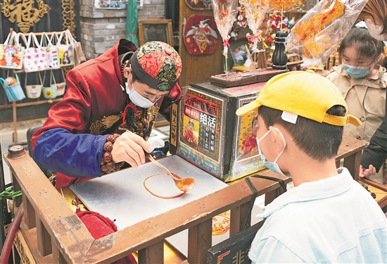 5月14日,小朋友在哈尔滨市老道外中华巴洛克历史文化景区观看手艺人制作糖画。