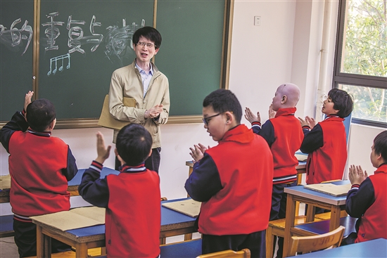 在福州市盲校音乐课堂上,陈君恩带领盲童们合唱。本报记者 李润钊 摄