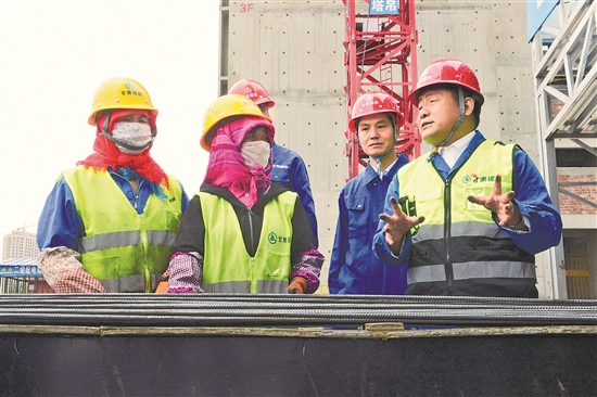 5月13日,兰州。由甘肃省建设工会工作委员会、甘肃建设投资(控股)集团有限公司工会委员会主办的弘扬劳模精神、劳动精神、工匠精神活动,在省政府为民实事保障性租赁住房项目举办。主办方邀请全国劳动模范、全国技术能手谢昌盛,全国五一劳动奖章获得者薛树春、吴建华、高鹏、罗节昌等8位劳模在施工现场为工人们传经送宝,宣讲“三个精神”。图为一位劳模(右一)在和工人交流。视觉中国 供图