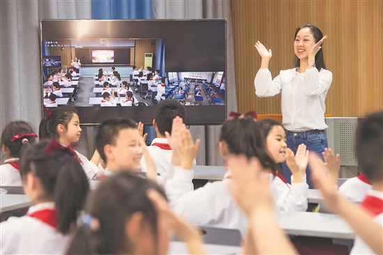 5月16日,在湖北省荆州市沙市大赛巷小学,学生通过“空中课堂”与偏远乡镇的丫角小学一起进行韵律操活动。当日,湖北省荆州市沙市大赛巷小学利用课后服务时间,开展劳动教育与实践、艺术类、体育类、益智类等活动。自“双减”政策实施以来,湖北省荆州市开设种类多样的课后服务活动,促进孩子们全面成长。新华社记者 肖艺九 摄