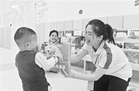5月13日,在毛南家园城北安置区婴幼儿照护服务指导中心,小朋友和指导老师(右)玩耍。今年5月,广西环江毛南族自治县在毛南家园城北安置区建成并运营一家婴幼儿照护服务指导中心,为这里易地扶贫搬迁移民及周边群众提供公益服务,助力婴幼儿快乐健康成长。