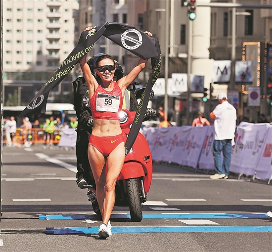 5月16日,在西班牙马德里举行的世界田联竞走巡回赛中,中国选手切阳什姐以43分07秒的成绩夺得女子10公里组冠军。图为切阳什姐在比赛中。视觉中国 供图