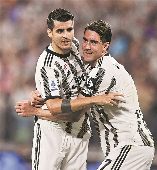 5月16日,尤文图斯队球员莫拉塔(左)进球后与队友弗拉霍维奇庆祝。当日,在2021-2022赛季意大利足球甲级联赛第37轮比赛中,尤文图斯队主场以2比2战平拉齐奥队。新华社发(费德里科·塔尔迪托 摄)