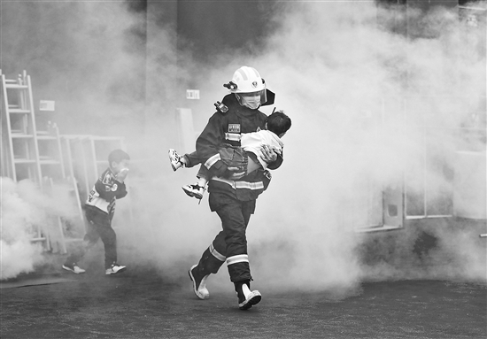 5月11日,消防员在贵州省铜仁市玉屏侗族自治县皂角坪幼儿园引导小朋友进行火灾逃生演练。