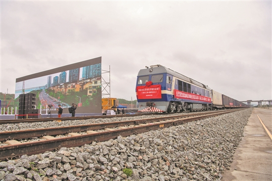 5月19日,首列成渝地区双城经济圈货运班列(重庆江津-成都青白江)在重庆江津小南垭铁路物流中心顺利发出,它共载货值300多万元的卷纸、粮油、汽摩配件等货品通过铁路直达成都城厢站。新华社记者 唐奕 摄