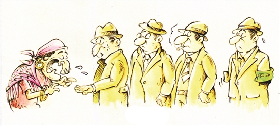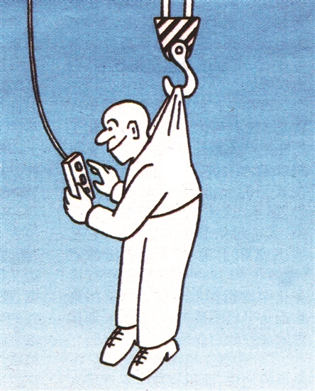 粗心大意的吊车工被自己操纵的机器绳钩在半空,悠哉乐哉好不自在。怎么没人提醒一声——老兄,收手吧,危险!