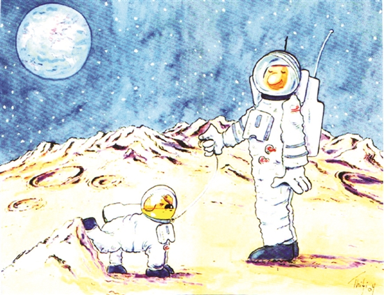 这只幸运的狗被宇航员带上月球,看起来它一切都听从指令跟随主人进行“工作”。美中不足是陋习难改,随地便溺。