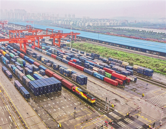 5月21日,全国首趟陆海新通道中老铁路“铁路快通”出境班列在重庆团结村中心站等候发车。
