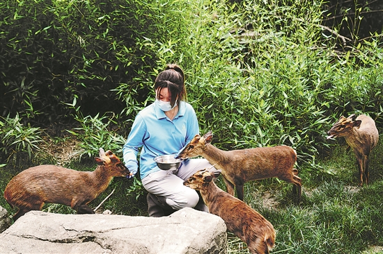5月19日,在上海动物园乡土动物区,饲养员和一群黄麂在一起。