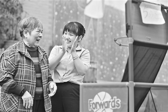 5月17日,在湖南省湘潭市雨湖区窑湾街道综合养老服务中心,养老护理员刘梦为投进球的老人鼓掌庆贺。近年来,该区将养老护理技能培训纳入职业技能提升行动,依托养老企业建立培训基地和实训基地,免费培训养老护理员近1000人次。新华社记者 陈泽国 摄