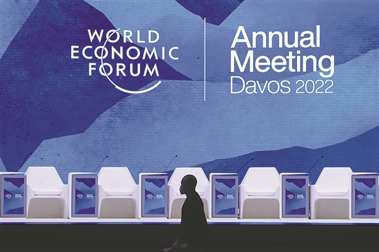 5月21日,在瑞士达沃斯,一名工作人员经过世界经济论坛年会主会场讲台。2022年世界经济论坛年会将于5月22日至26日在瑞士小镇达沃斯举行。世界经济论坛总裁博尔格·布伦德在会前表示,如今全球发展面临诸多“拦路虎”,世界各国应巩固信任,加强合作,携手应对挑战。新华社记者 郑焕松 摄