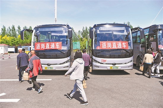 5月22日10时,在吉林省长春市,4辆承载150名返长复工农民工的大巴车,从榆树市出发到达长春高速东口。长春市和榆树市人社部门还为返岗复工人员准备了包含防疫物资与旅途食品的“爱心复工礼包”。人民视觉 供图