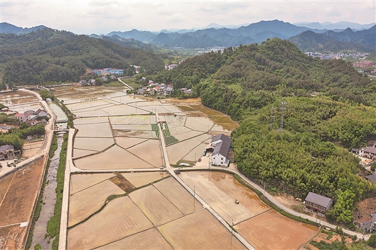 5月23日拍摄的杭州市临安区太阳镇太阳米种植基地稻田(无人机照片)。