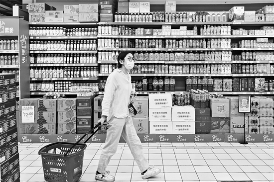 5月21日,北京的一家超市设置了茶饮料专区供消费者挑选。