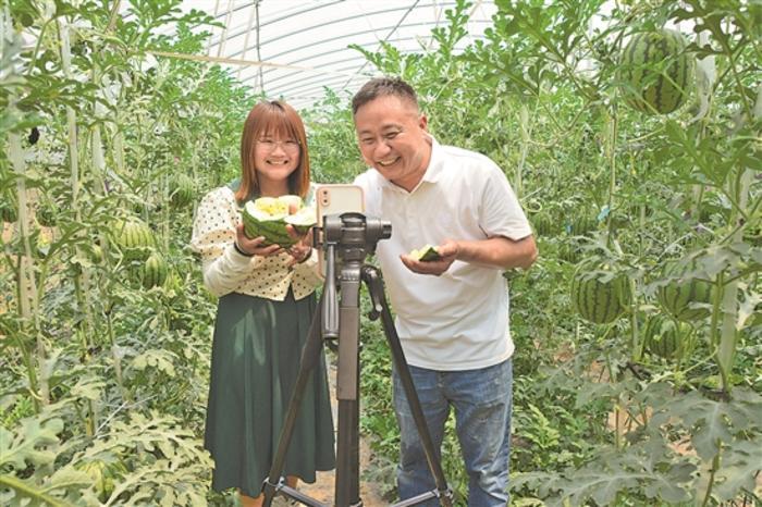 5月24日,河南省安阳市内黄县“省金牌带货驻村第一书记”何艳军和县“十佳”直播达人赵园园在村西部农场西瓜种植基地现场直播推销西瓜。近年来,该县积极探索电商发展路径,走出了一条“电商+扶贫+农特产品”的新路子,有效助力乡村振兴。本报通讯员 翟书生 董俊玲 摄