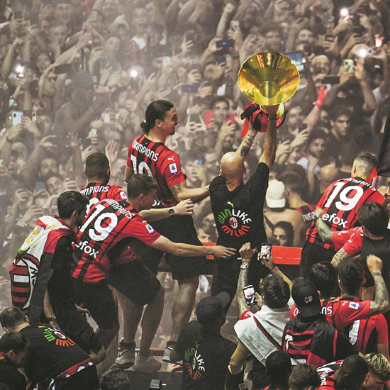 5月23日,AC米兰队成员高举奖杯与球迷共庆夺冠。新华社发(阿尔贝托·林格利亚 摄)