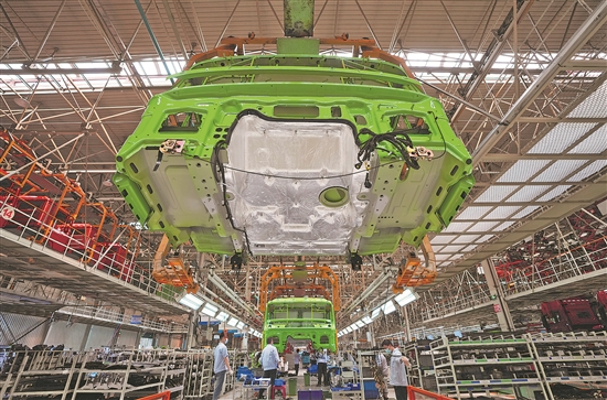 5月24日,工人在陕西汽车控股集团有限公司总装车间进行重型卡车装配。