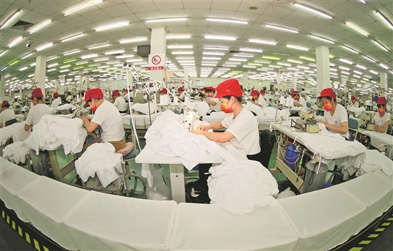 5月26日,在安徽省阜阳市太和县,一家服装企业工人生产出口到海外的服装。