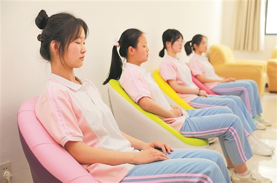 5月26日,在安徽省淮北市第十二中学校园心理健康辅导站,学生坐在“放松椅”上放松。高考临近,多地学校组织高三学生开展不同类型的减压活动,帮助学生们释放压力,以轻松的状态迎接高考。新华社发(万善朝 摄)