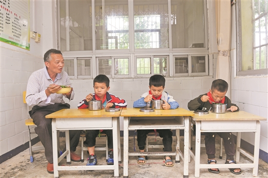 在广西贺州市昭平县五将镇良风村小学冲尾教学点,龚寿新和学生一起吃午饭(5月25日摄)。
