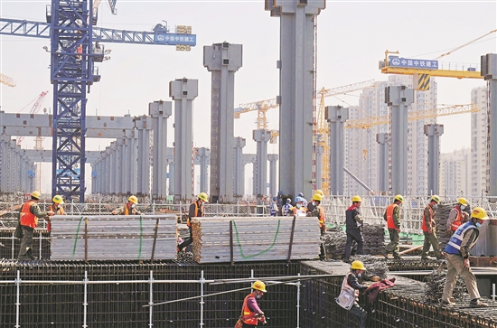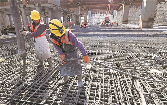 2020年4月13日,施工人员在二楼高架候车室的施工中浇筑混凝土。