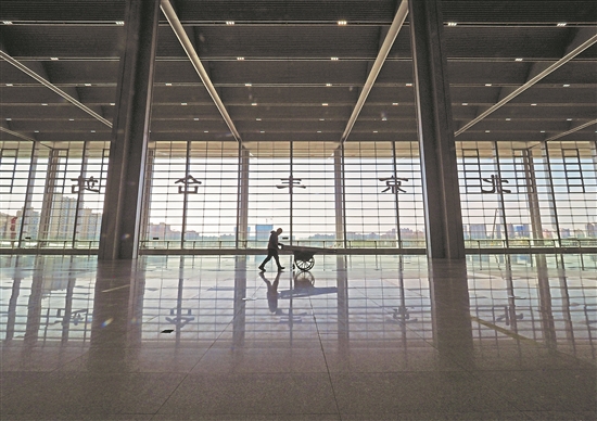 2022年3月31日,车站施工已进入尾声,一名工人推着施工小车快速走过二楼候车大厅。