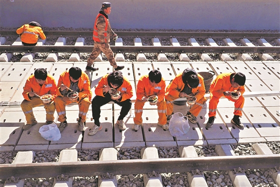 2022年2月24日,为了节约时间,建设者便在施工现场吃午饭。