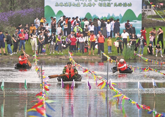 5月28日,在浙江省湖州市吴兴区东林镇保国村倪家湾港,人们参加“庆端午 划菱桶”趣味比赛。