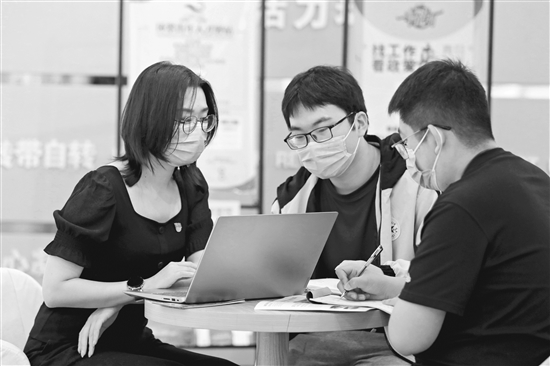 5月25日,山东省威海市环翠区环翠楼商圈“青年驿站”工作人员(左)为求职大学生提供就业咨询服务。近期,该区在辖区内打造10处“青年驿站”,为符合条件的外来青年学子提供不超过5天的免费住宿,以及政策解读、技能培训等服务,成为青年人才融入威海的“温馨港湾”。新华社记者 朱峥 摄