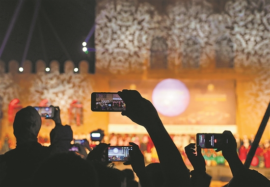 5月28日,观众在埃及开罗举办的第九届埃及国际鼓乐与传统艺术节闭幕式上拍照。当日晚,第九届埃及国际鼓乐与传统艺术节在首都开罗萨拉丁城堡举行闭幕式。