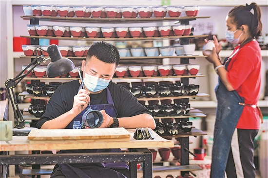5月31日,在辽宁抚顺大官窑陶瓷文创园,抚顺大官窑陶瓷制作技艺代表性传承人、沈阳工学院教授王永亮与同事一起研发制作大官窑陶瓷。多年来,王永亮将大官窑陶瓷制作技艺带进大学课堂,在做好非遗传承工作的同时带动不少毕业生从事大官窑陶瓷制作工作。张文魁 摄