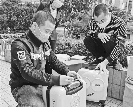 “小白”家长们从“福建金丝带”领取到装有初次入院必备物资的“白宝箱”。本报记者 李润钊 摄