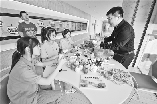 5月25日,留学归国人员陈真(右一)给学生们上“草编技艺课”。当日,浙江省湖州市“E享未来”共富班车首发仪式举行,活动现场留学归国人员为随迁子女学校学生进行公益宣讲,并进行大手牵小手结对等活动,为他们的健康成长创造良好条件。