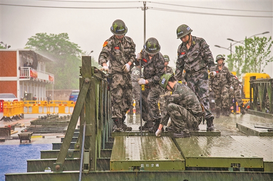6月1日,浙江省公路应急钢桥架设比武金华赛区场地上,公路应急保障队员在冒雨架设公路应急钢桥。当日,浙江省公路与运输管理中心举行全省公路应急钢桥架设综合比武,共有10支队伍在各地市分赛区参赛,并以视频连线直播的方式同步举行。本报通讯员 胡肖飞 摄
