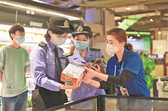 图为5月30日,执法人员在盒马鲜生十里堡店进行执法检查。