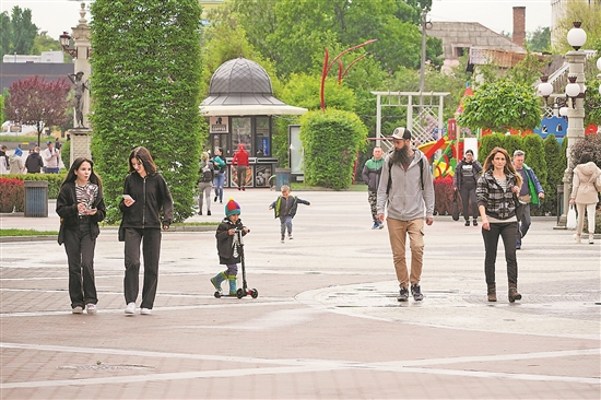 ①5月31日,当地居民在乌克兰基辅州伊尔平中心广场散步。
