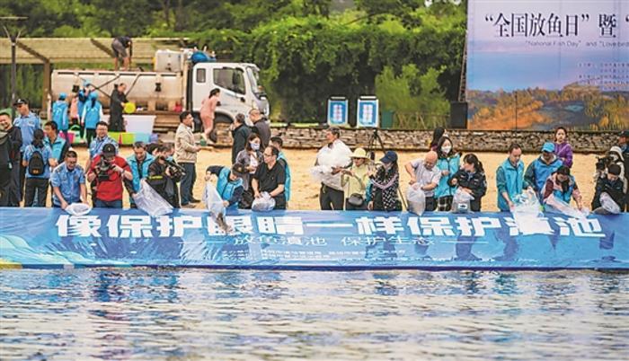 当日是第八个全国“放鱼日”,云南省昆明市滇池管理局与昆明市晋宁区人民政府在滇池南岸联合举办“全国放鱼日”活动。新华社记者 江文耀 摄