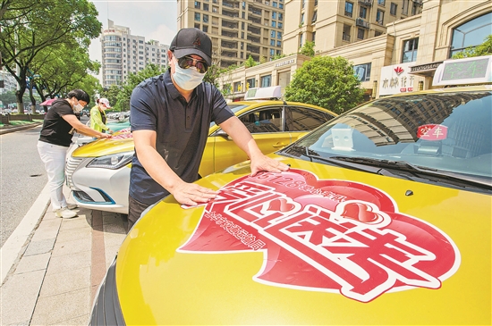 6月6日,浙江省金华市街头,出租车司机在车身上贴上“爱心送考”标志后集体出发。当天,金华市2022年“爱心送考”活动正式启动。