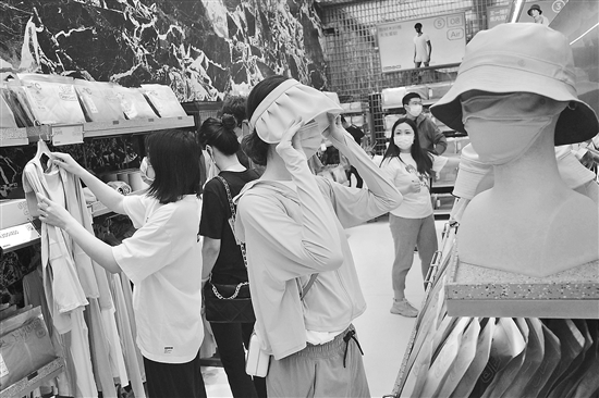 随着夏日酷暑来临,人们生活出行防晒类产品销售火爆。除了日常的防晒霜、遮阳伞,用科技面料制成的防晒衣、防晒帽、防晒口罩等产品也深受消费者喜爱。本报记者 刘金梦 摄