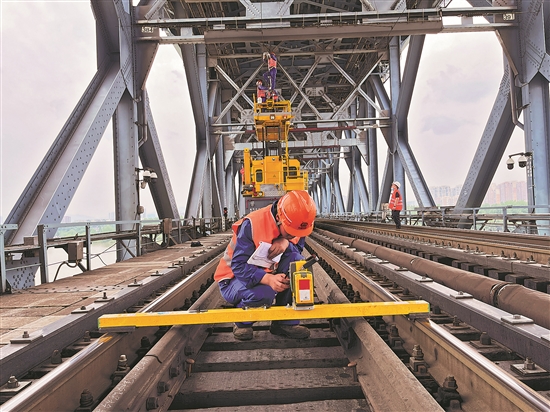 图为作业人员在南京长江大桥上测量设备状态。杜希昊 摄