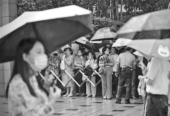 6月7日,高考首日,在福建省福州三中考点外,家长们雨中送考。