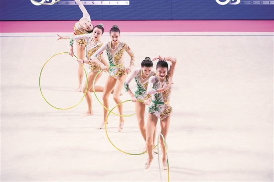 当地时间6月5日,在2022年国际体联艺术体操世界杯意大利站集体全能比赛中,由郭崎琪、黄张嘉洋、郝婷、王澜静、蒲彦竹组成的中国队以总分60.650分获得铜牌。金牌被东道主意大利队斩获,保加利亚队获得银牌。图为中国队在比赛中。