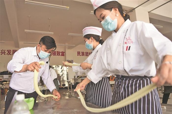 近年来,甘肃省天水市张家川回族自治县大力打造“张家川伊香拉面师”劳务品牌,开办为期15天的“拉面大课堂”,免费为当地农村群众培训拉面技能,帮助他们走上创业致富的道路。截至2021年底,“拉面大课堂”已累计培训14000多人。新华社记者 陈斌 摄