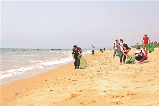 当日是第十四个“世界海洋日”和第十五个“全国海洋宣传日”,志愿者来到海滩上清理垃圾,呼吁人们减少污染,保护海洋环境。