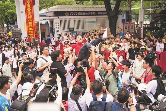 6月9日,在湖南省长沙市一中考点外,学生抛起老师庆祝高考结束。