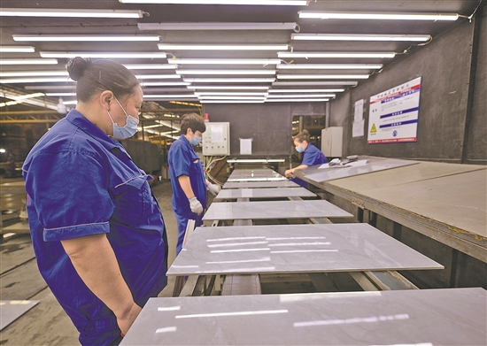 6月7日,索菲亚新型建材有限公司员工检查瓷砖质量。该公司疫情期间停工四天后复工复产。