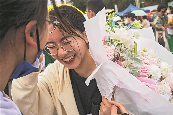 6月8日,云南省2022年高考结束。在昆明第一中学考点,一名考生走出考场,收到好友准备的鲜花后,开心地笑了。