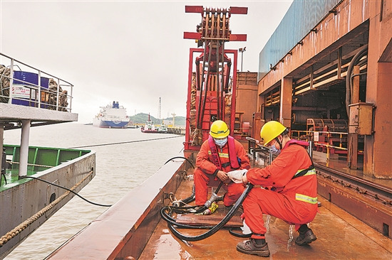 6月10日,浙江省宁波舟山港穿山港区中宅矿石码头投资470万元的低压船舶岸电系统启用,为“朝日2”轮连船并网供电。岸点系统不仅降低了船舶燃油成本,还减少噪声及废气的排放,达到船舶靠泊码头的“零油耗、零排放、零噪声”要求。图为电工班班员在接上岸电线缆。蒋晓东 蔡迪烽 摄