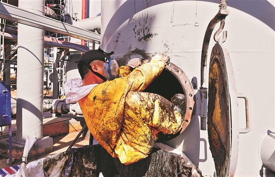 塔内空间有限,其他设备进不去,维修工只能用一根细铁丝一点点疏通。天气热、空间小、装备笨重,为了安全起见,每人干20分钟必须出舱休息。